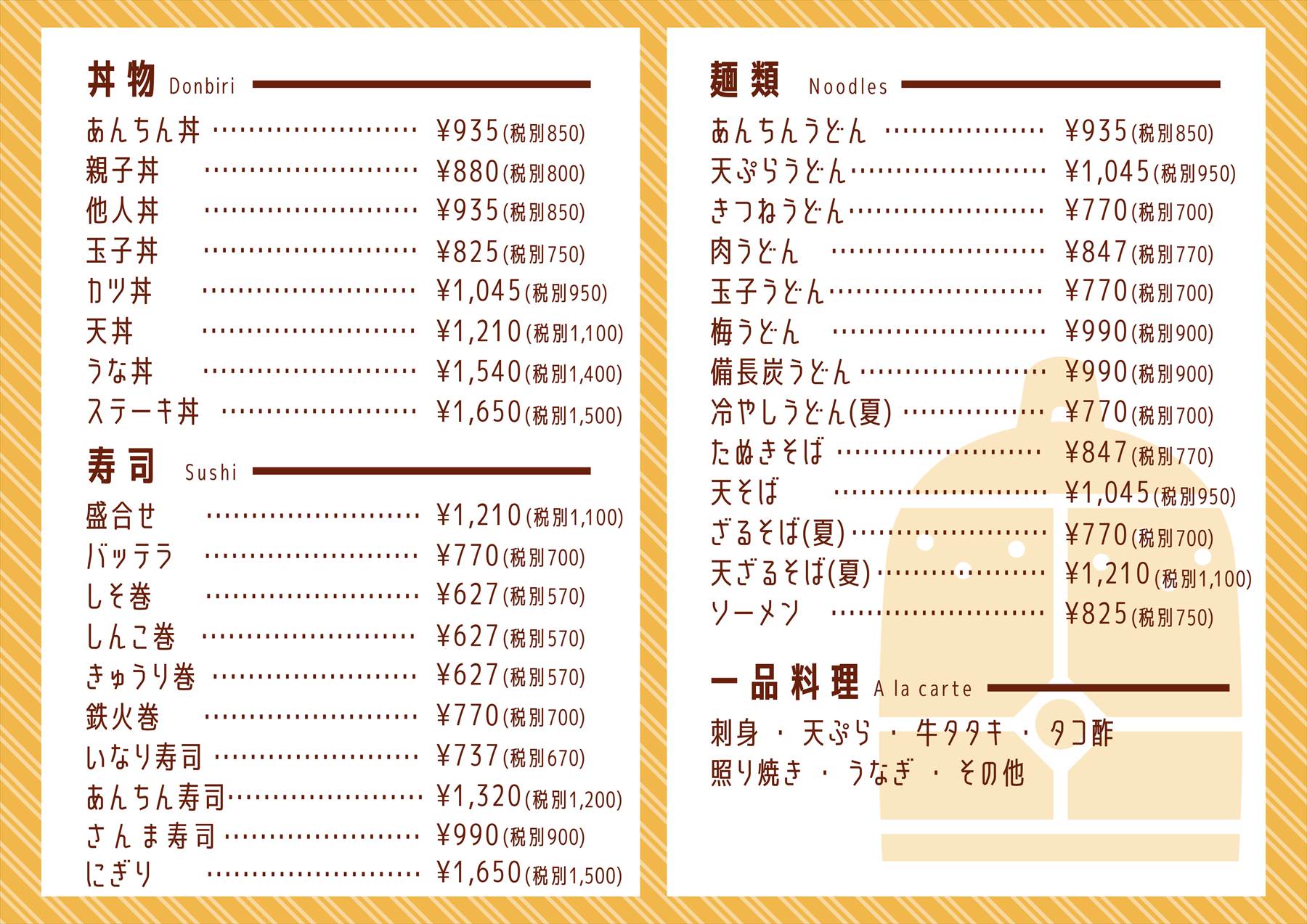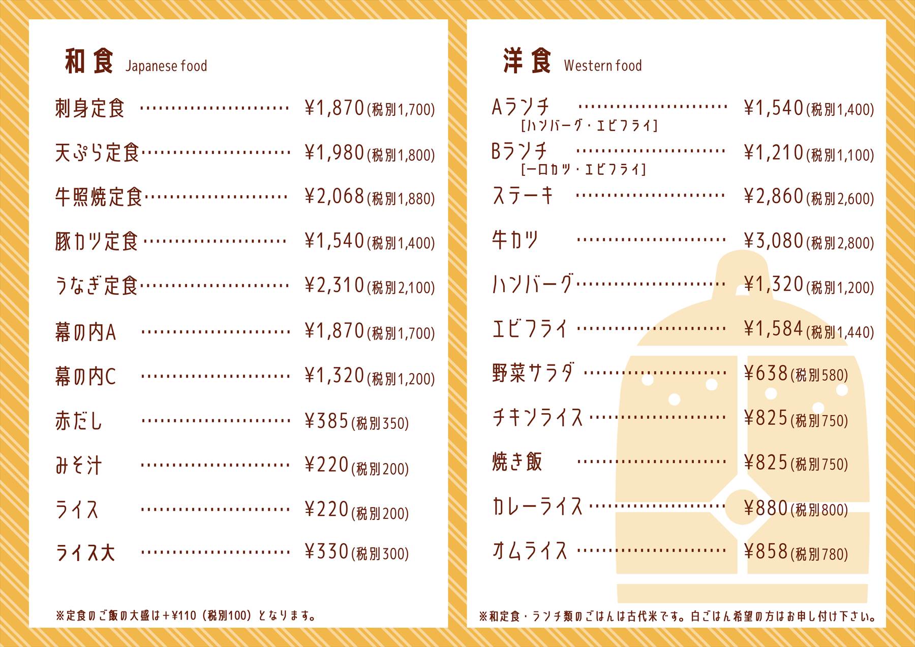 レストランメニュー 熊野牛 魚 梅豚 みかん鶏 カレー 熊野牛 熊野牛すき焼き御膳 ◇小鉢2種 ◇ご飯 ◇味噌汁 ◇お漬物 付き 2000円(2200円税込) 熊野牛冷しゃぶ御膳 ◇小鉢2種 ◇ご飯 ◇味噌汁 ◇お漬物 付き 1900円(2090円税込) 特選熊野牛卵とじ丼 ◇味噌汁 ◇お漬物 付き 1250円(1375円税込) 特選熊野牛丼 ◇味噌汁 ◇お漬物 付き 1150円(1265円税込) 魚 生鮪衣揚件 御膳 ◇小鉢1種 ◇ご飯 ◇味噌汁 ◇お漬物 付き 1800円(1980円税込) お任せお魚3種天羅御膳 ◇小鉢1種 ◇ご飯 ◇味噌汁 ◇お漬物 付き 1600円(1760円税込) 梅真鯛衣揚げ 御膳 ◇小鉢1種 ◇ご飯 ◇味噌汁 ◇お漬物 付き 1450円(1595円税込) 鱧照り焼き御膳 ◇小鉢1種 ◇ご飯 ◇味噌汁 ◇お漬物 付き 1300円(1430円税込) 梅豚 梅豚ヒレカツ御膳 ◇小鉢1種 ◇ご飯 ◇味噌汁 ◇お漬物 付き 1600円(1760円税込) 梅豚生姜焼き御膳 ◇小鉢1種 ◇ご飯 ◇味噌汁 ◇お漬物 付き 1300円(1430円税込) 豚角煮御膳 ◇小鉢1種 ◇ご飯 ◇味噌汁 ◇お漬物 付き 1500円(1650円税込) みかん鶏 みかん鶏照り焼き御膳 ◇小鉢1種 ◇ご飯 ◇味噌汁 ◇お漬物 付き 1150円(1265円税込) みかん鶏唐揚御膳 ◇小鉢1種 ◇ご飯 ◇味噌汁 ◇お漬物 付き 1350円(1485円税込) みかん鶏南蛮漬け御膳 ◇小鉢1種 ◇ご飯 ◇味噌汁 ◇お漬物 付き 1450円(1595円税込) みかん鶏カツ御膳 ◇小鉢1種 ◇ご飯 ◇味噌汁 ◇お漬物 付き 1450円(1595円税込) カレー 牛ステーキカレー 1800円(1980円税込) 梅豚ヒレカツカレー 1150円(1265円税込) みかん鶏カツカレー 1050円(1155円税込) その他メニュー 和食・洋食 丼物・寿司・麺類・一品料理 ドリンク